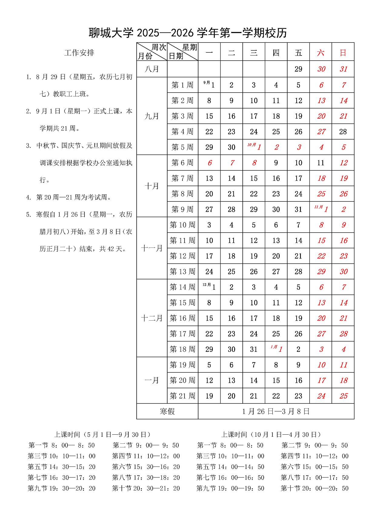 聊城大学2025——2026学年第一学期校历